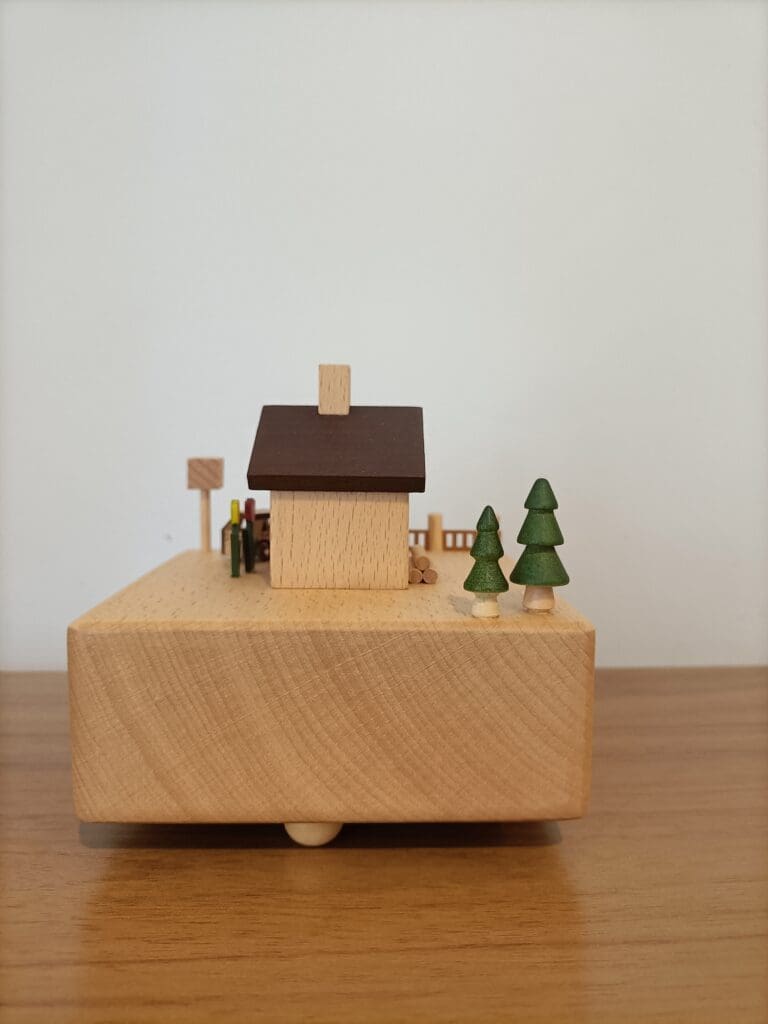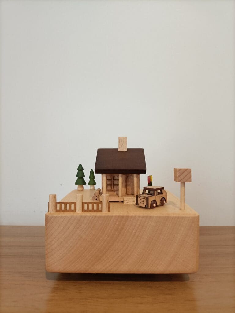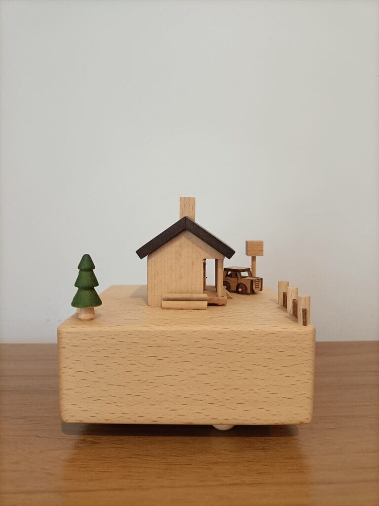 Wooden cabin theme, wind up with on off switch, and magnetic drive around car.