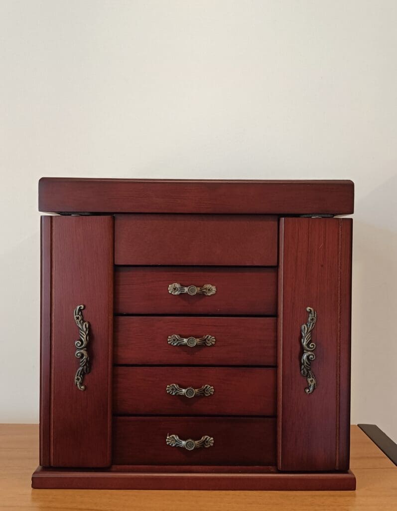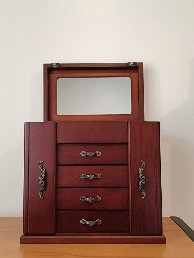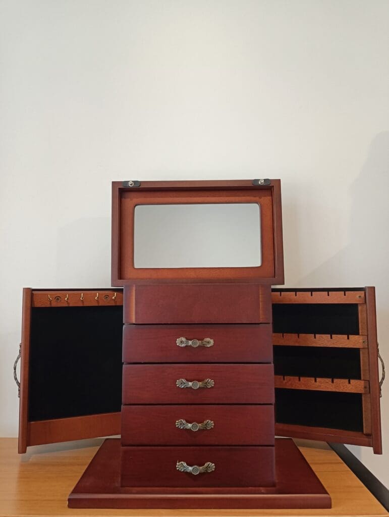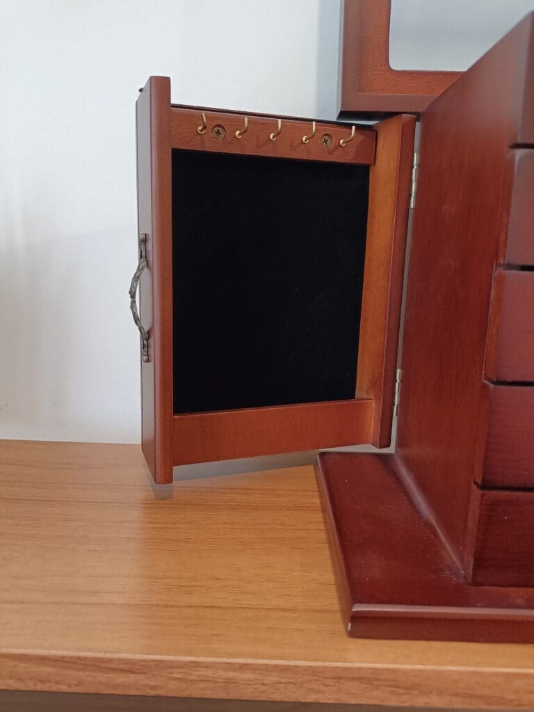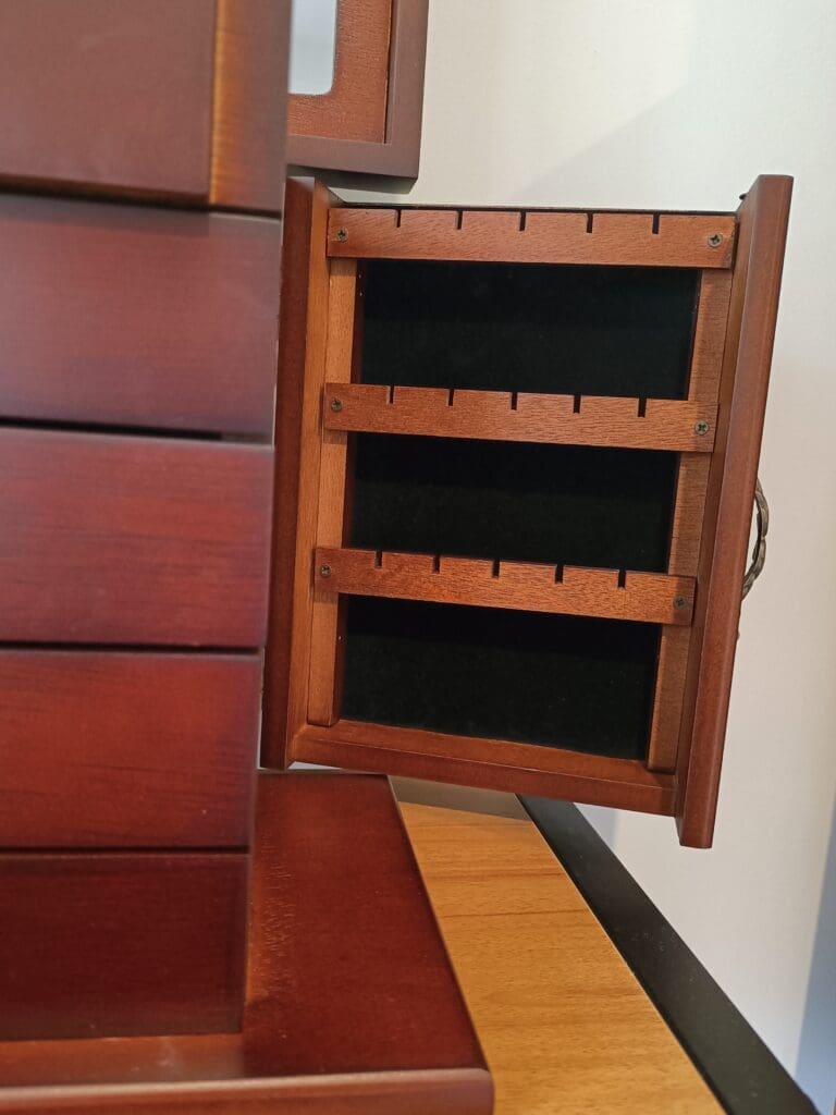 Stunning wooden jewellery box, with a mirror in the lid. Both sides fold out and are completed with necklace hangers. As well as four drawers.