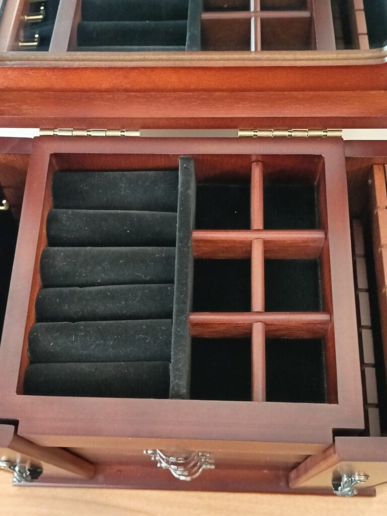 The bottom two drawers are empty and the top two are both divided into four. The top compartment is seperated into two. One half has ring holders, and the other half is sectioned into six.