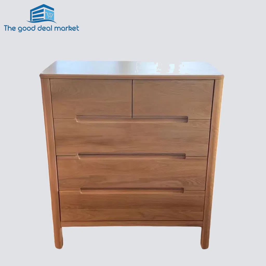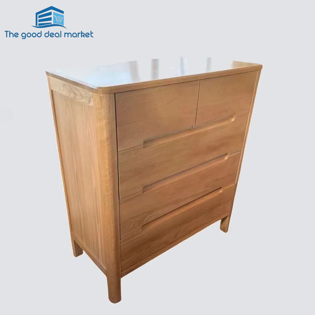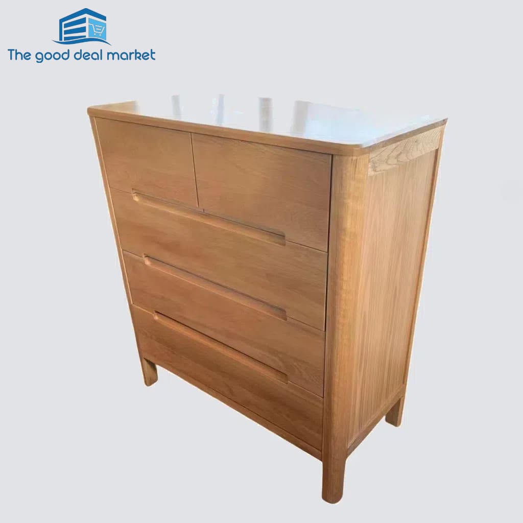 Amazingly simple and abundantly spacious with just the right height, the Island dresser is the perfect storage solution for the bedroom. With five drawers, it offers enough space for impeccable organization and you can say goodbye to clutter! The American Oak construction with stunning natural variations makes every Island dresser a unique piece to be adored and admired. The natural finish makes it an effortless blend in most room décors. The smooth top gives you a place for photo frames with cherished photos, a statement vase or any other keepsakes.